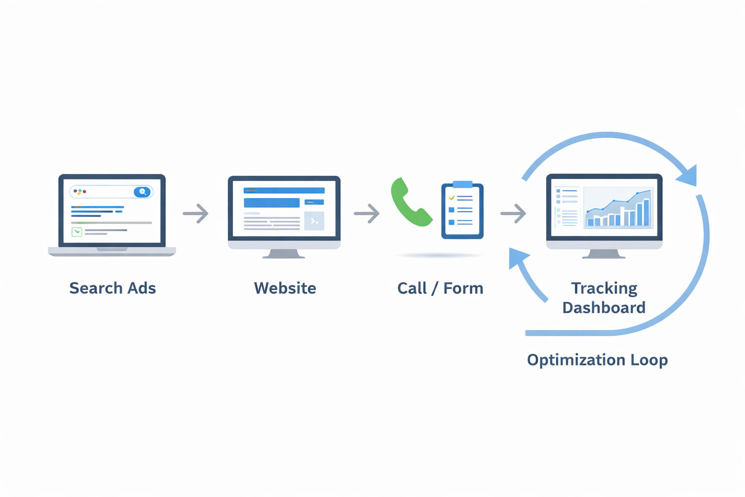Campaigns are built, conversion tracking is installed, and inbound lead capture is fully configured.